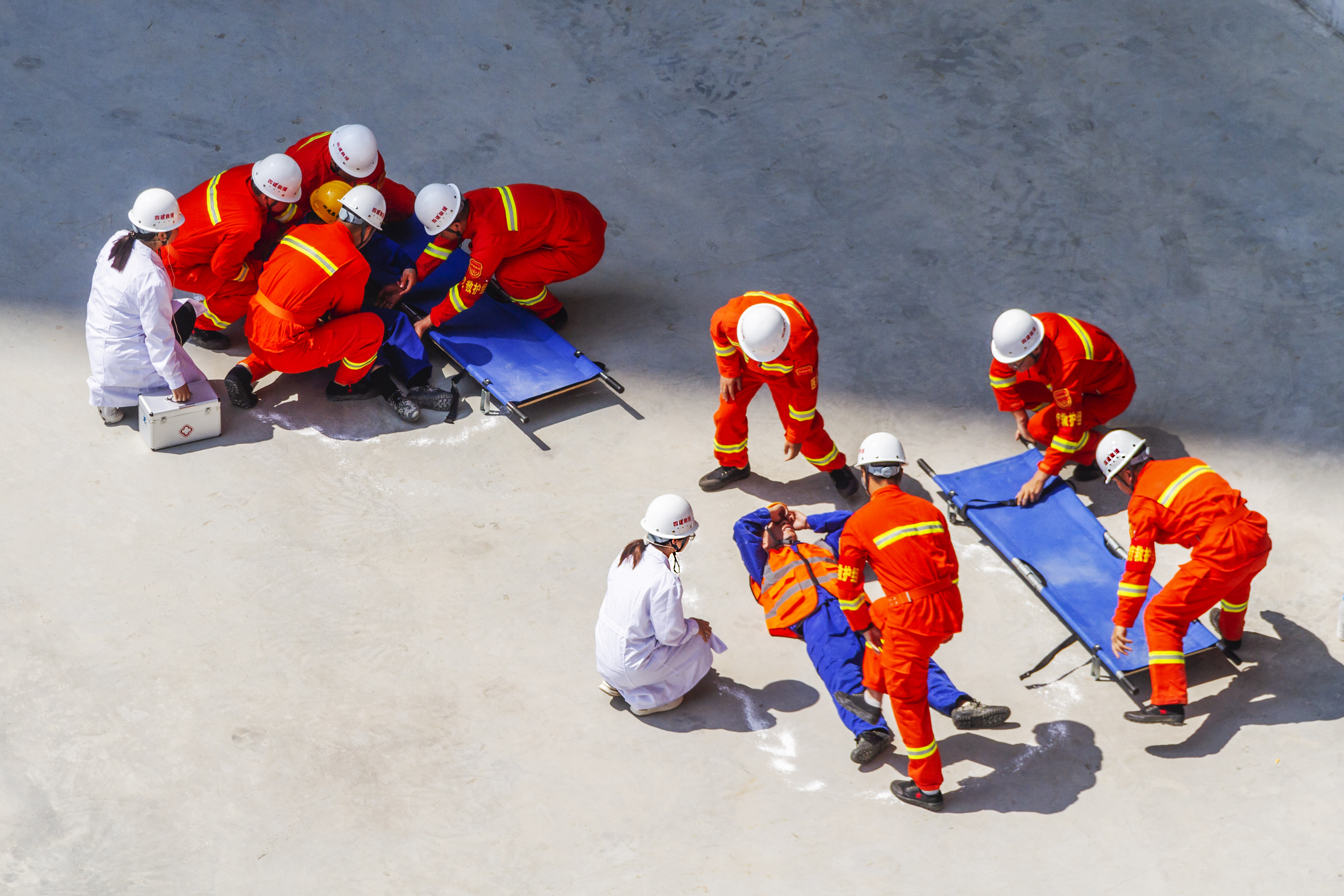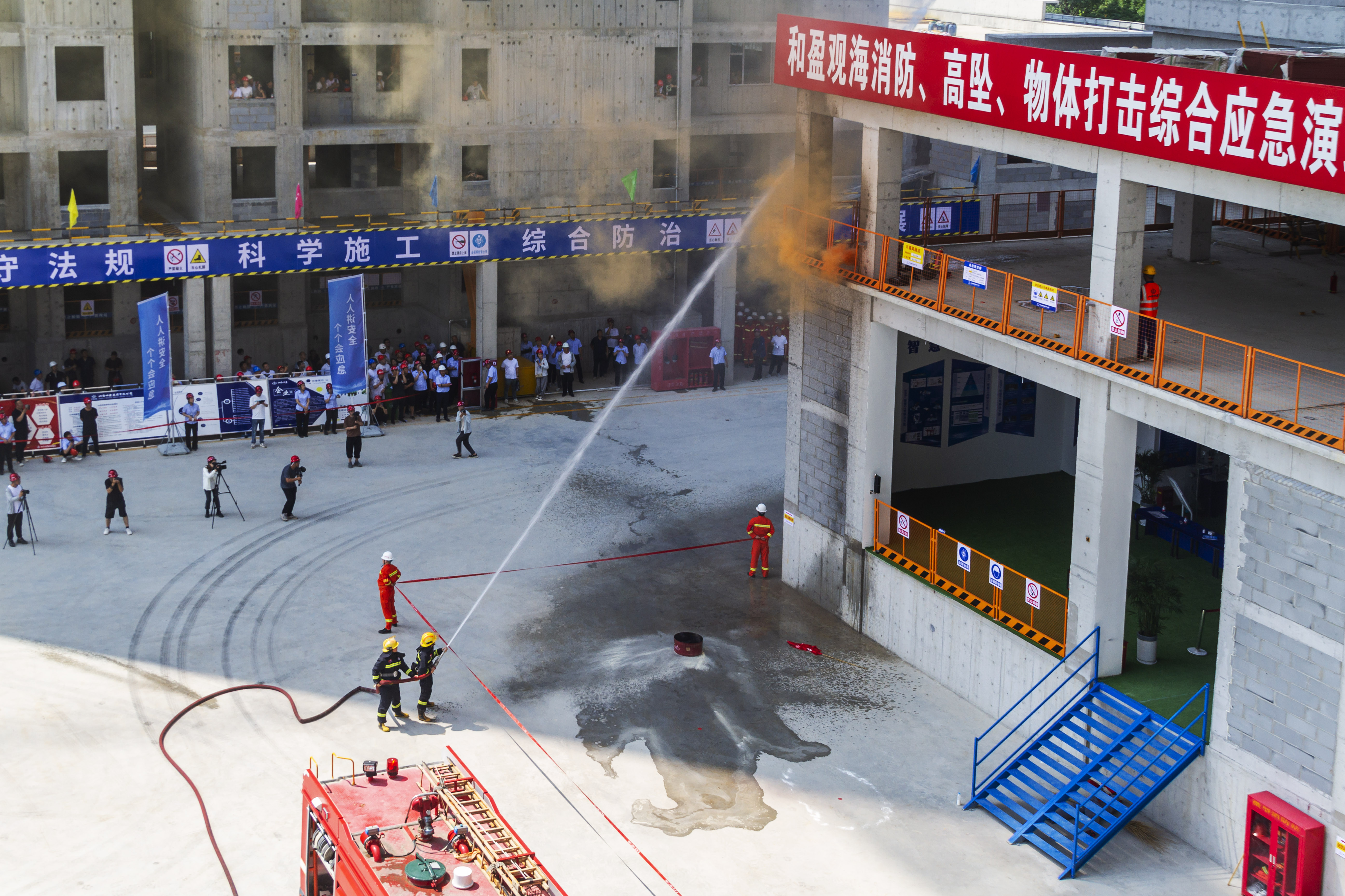 观摩结束后,和盈观海项目进行了消防、高空坠落、物体打击综合应急演练,对预案的可行性进行了检验,整个演练过程救援及时、处置得当,应急预案科学合理。