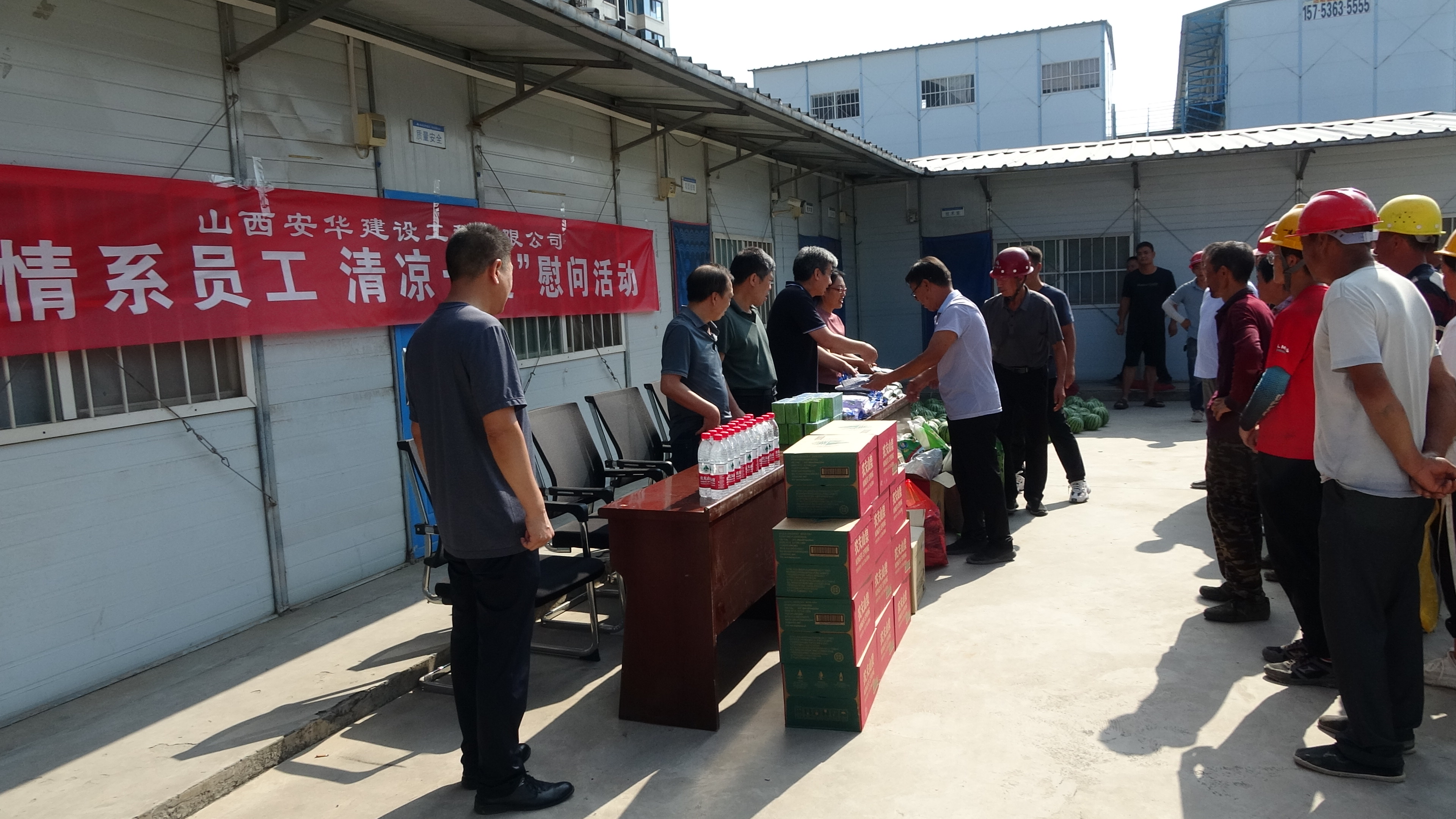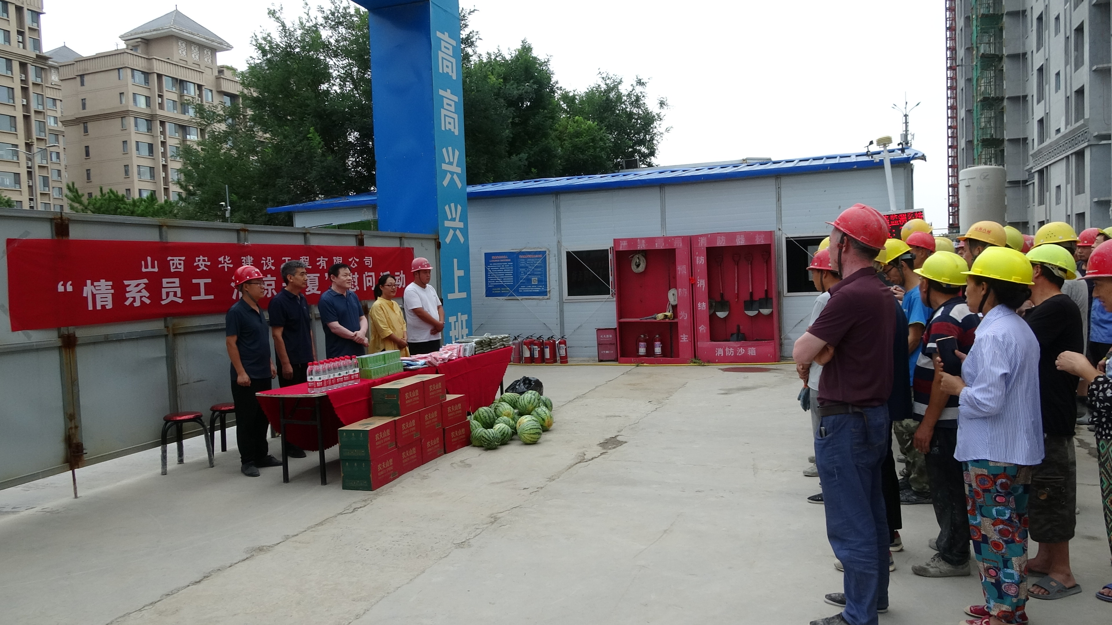 为做好项目部一线人员夏季防暑降温工作,保障职工健康权益,改善职工生产生活条件。近日,公司工会主席原成民,副主席闫俊康、刘晶晶,副总经理谭晓森、柴贵杰,人力资源部经理马小红一行分别深入河津安华·阳光嘉苑项目和新绛正远·紫东雅境项目开展了夏送清凉活动,为项目部送去了矿泉水、绿豆、西瓜、毛巾和风油精等防暑降温品,给大家在炎炎夏日里送去了一丝清凉。