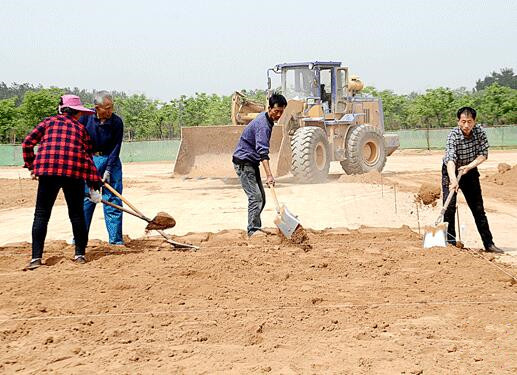 5月1日,由我公司承建的市公共体育场田径跑道和足球场建设项目工地上,铲车来来回回作业,工人们正在铲土,加紧土方施工作业,技术人员正在进行测量、放线,施工现场紧张有序。