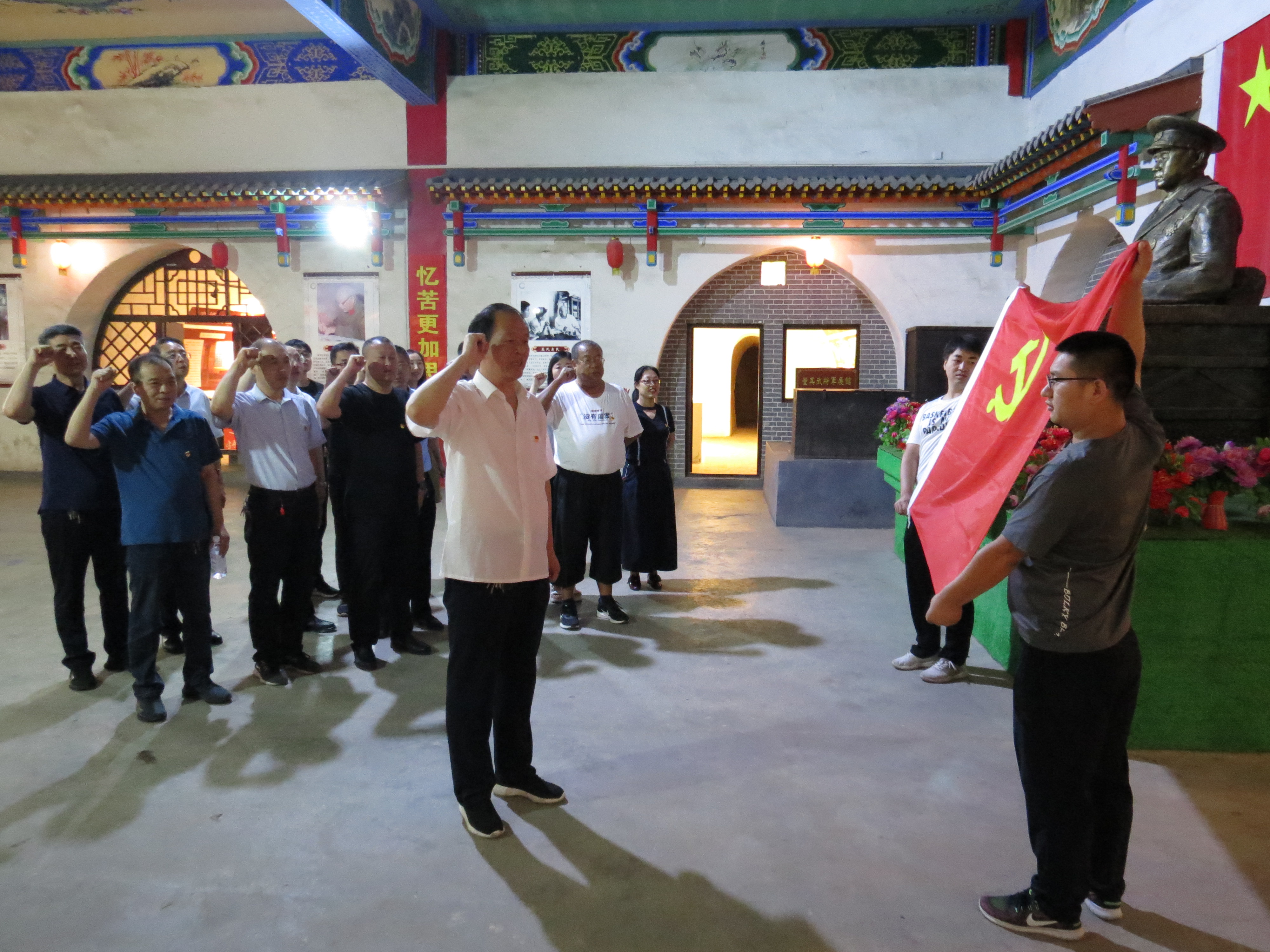 在董其武将军纪念馆,大家先后参观了董其武将军家风家教的版面和他生前所用桌椅、沙发、皮箱、书籍等物品,在导游的详细讲解下,大家认真聆听了董其武将军革命时期的英勇事迹和革命时期当地艰苦抗战的历程,一张张图片,一件件展品,再现了董其武将军的丰功伟绩,他高尚的人格魅力感染着现场每一位参观者。“为迎春风排万难,义旗终插青山巅”,董其武将军一生努力,一心为民,不仅完成了自己少年时的夙愿,更为新中国的成立立下了汗马功劳,他留给我们的不仅仅是一笔财富,一种力量,更是一种信念。在纪念馆大厅董其武将军铜像前,24名党员同志在党总支副书记黄建荣的带领下,重温了入党誓词。随后,在导游的引领下,大家参观了长达三千米三层的景观地道,真真切切感受到浓厚的革命气息,大家无不为抗战时期人民的智慧和力量点赞。